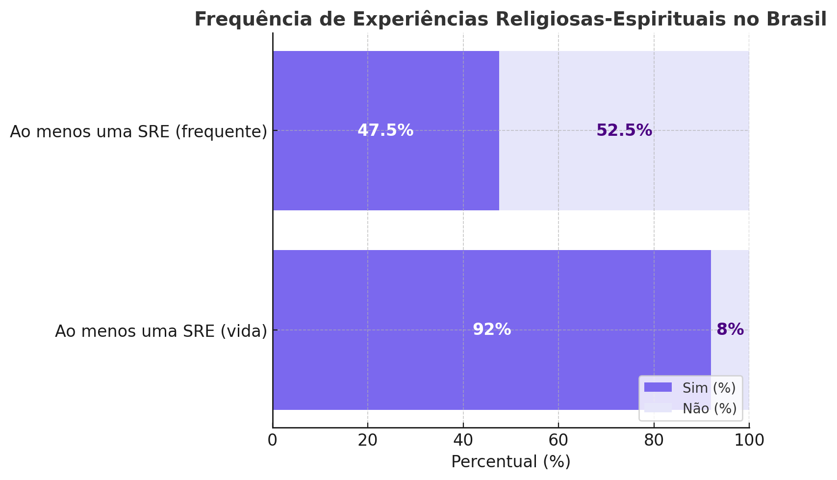 - Altíssima incidência — Que 92% da amostra brasileira refira ao menos uma SRE mostra que tais vivências são quase universais e não “raras” ou “anômalas” no sentido de serem exceção.